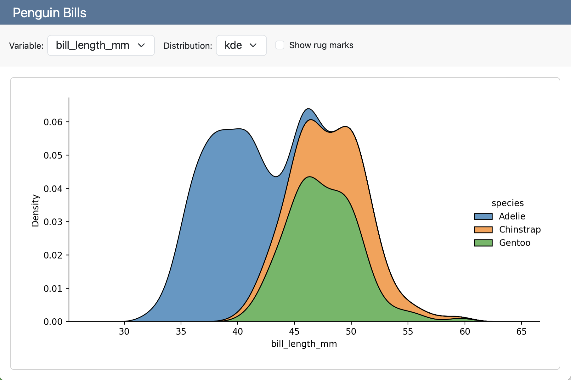 A screenshot of a Penguin Bills card. The card sidebar on the left contains two dropdown menus, one for Variable and one for Distribution and a checkbox to show rugmarks. To the right, a plot shows a histogram of bill_length_mm colored by species.