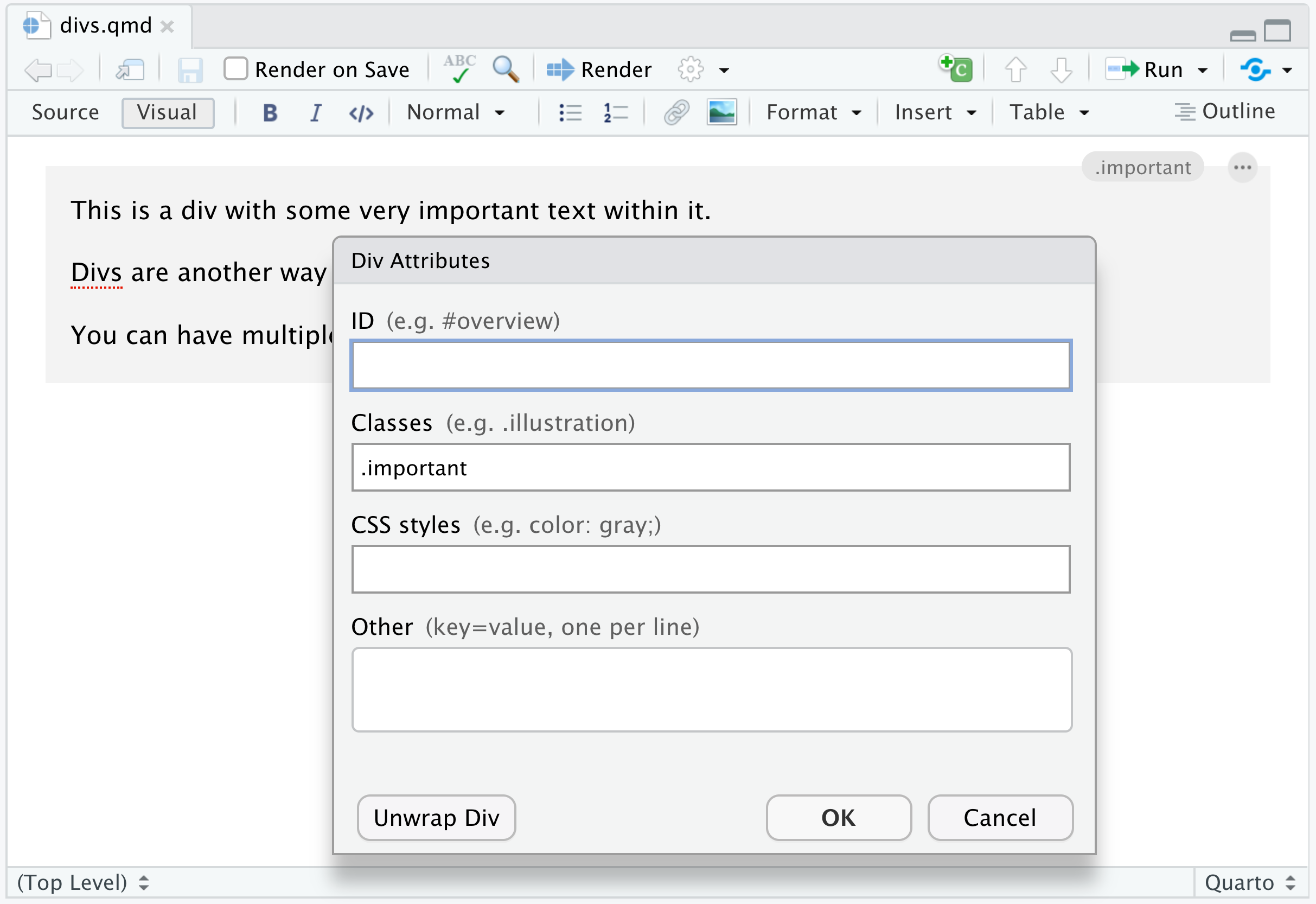 Note the presence of the .important class within the Div Attributes dialog.