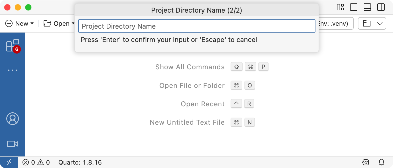 To create a new website project within Positron, execute the Quarto: Create Project command from the command-palette: