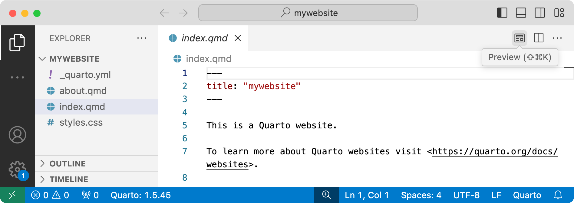 The new website project will be created and opened within VS Code. Click the Preview button (Preview iconPreview icon)to preview the website: